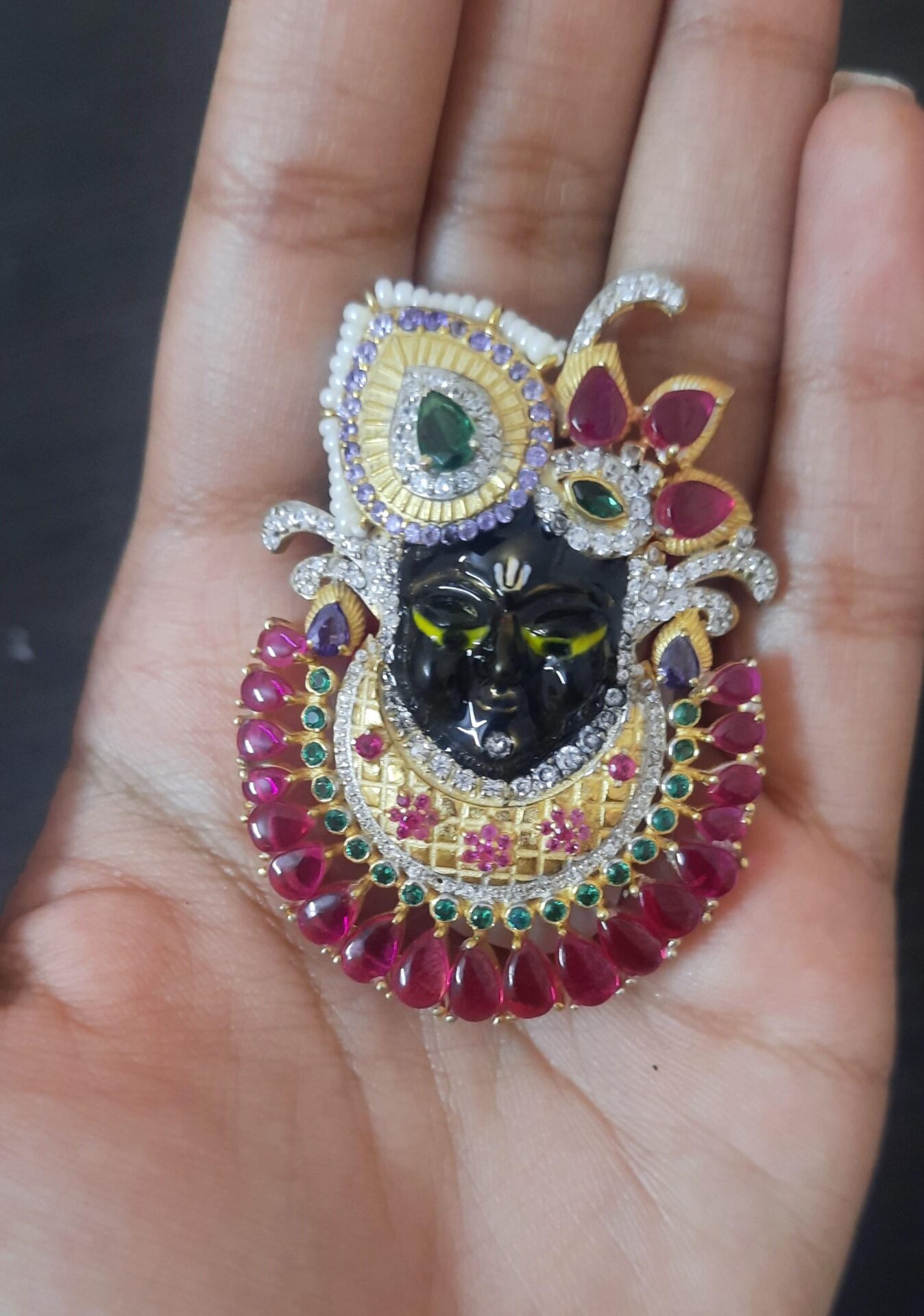 ♥ Divine Shrinathji Swaroop Brooch with Ruby and Emerald Gemstone in Sterling Silver 925 ♥