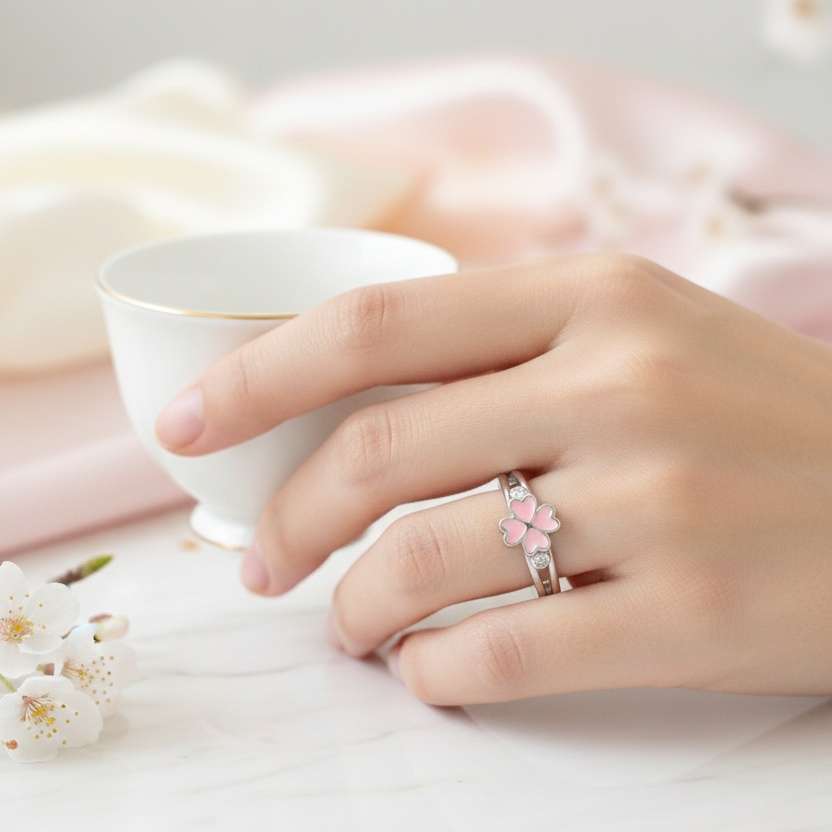 ♥ Cute Enamel Pink Flower Ring for women in Sterling Silver 925 ♥ Gift for women ♥