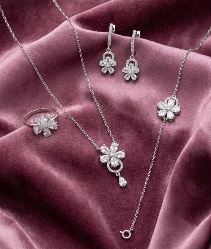 ♥ Floral Crystal Jewelry Set in Sterling Silver 925 with Earrings & Bracelet ♥ Beautiful Handmade Jewelry Set ♥ A complete set of earrings, necklace, bracelet and ring ♥ Perfect compliment for your Dress ♥