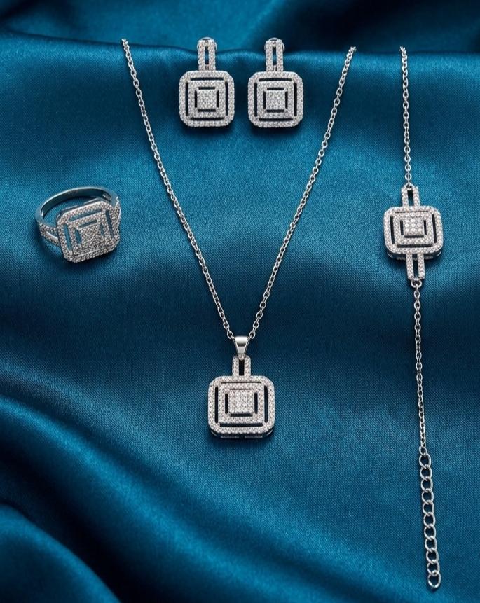 ♥ Geometric Square Halo Crystal Jewelry Set in Sterling Silver 925 with Earrings & Bracelet ♥ Beautiful Handmade Jewelry Set ♥ A complete set of earrings, necklace, bracelet and ring ♥ Perfect compliment for your Dress ♥