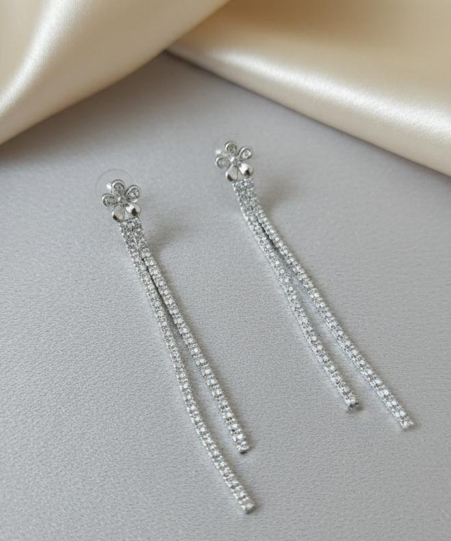 ♥ Pavé Flower and Crystal Tassel Drop Earrings for women in sterling silver 925 ♥ Amazing Gift for her ♥