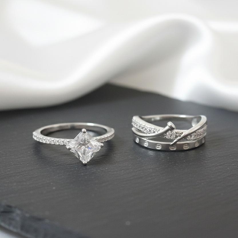 ♥ Sleek High-Shine Square Solitaire with Triple-Row Pavé Wedding Set in Sterling Silver 925 ♥ Sterling Silver Solitaire Ring ♥ Cocktail Ring ♥